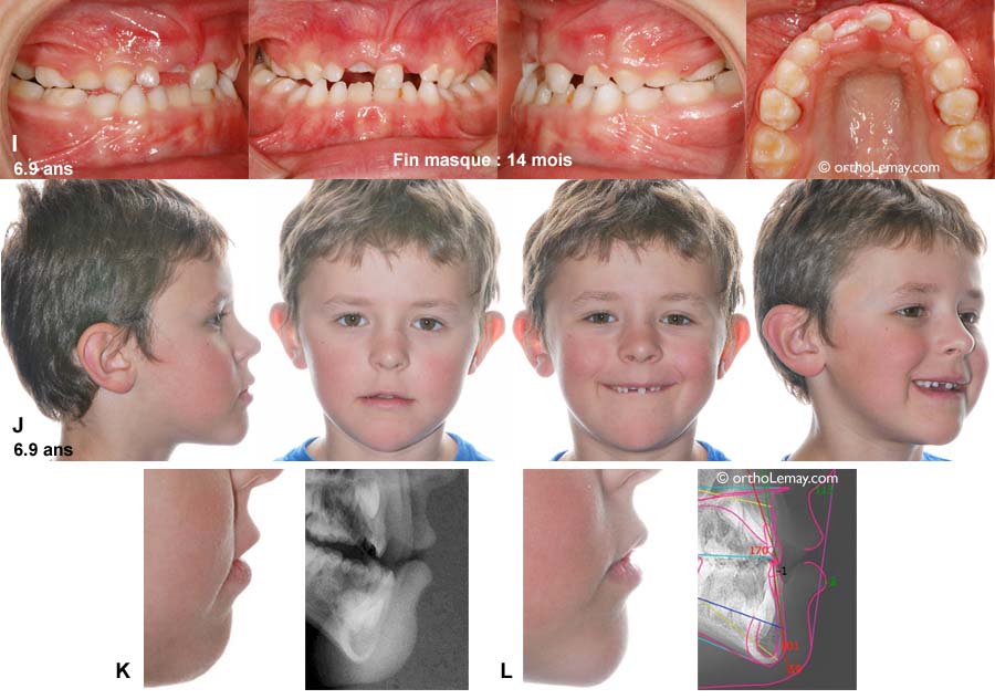 (J) Profil et esthétique du visage à la fin du port du masque. L’équilibre du visage est meilleur, les lèvres sont plus avancées, il y a eu croissance du menton (mandibule). Comparez avec le visage pré-traitement en “A”.