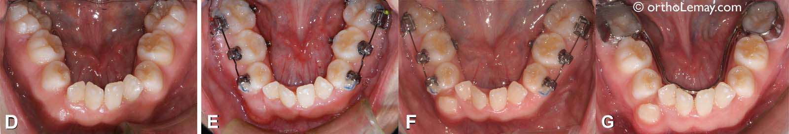 (G) Après l’expansion mandibulaire, un mainteneur d’espace est utilisé (fil lingual fixe) pour éviter toute constriction de l’arcade et perte de l’expansion obtenue.