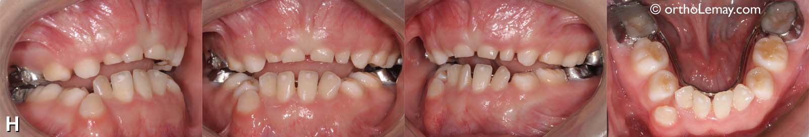 (H) Résultat final: les deux arcades ont été élargies significativement et le tout est maintenu avec des mainteneurs d’espace à chaque arcade en attendant l’éruption des autres dents permanentes, ce qui prendra encore quelques années.