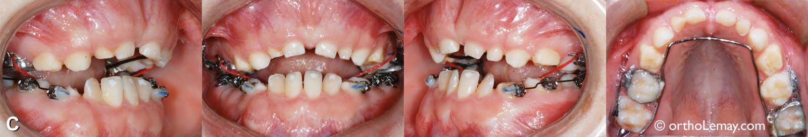 (C) Une fois l’expansion maxillaire complétée, l’appareil d’expansion fut retiré et remplacé par un mainteneur d’espace fixe (fil lingual) pour éviter toute récidive de l’expansion obtenue. La seconde étape consistait en la pose d’appareils multi-bagues fixes (“broches”) dans la région postérieure des deux arcades pour faire de l’expansion dento-alvéolaire à l’arcade inférieure afin de l’harmoniser avec la nouvelle largeur de l’arcade supérieure. Des élastiques en configuration croisée attachés à l’extérieur de l’arcade supérieure et à l’intérieur de l’arcade mandibulaire (visibles en rouge sur les photos) ont permis de déplacer les dents inférieures vers l’extérieur pour élargir l’arcade.