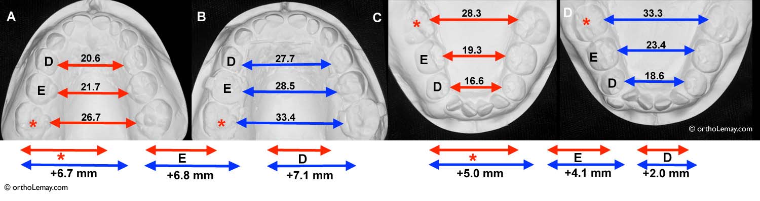 Les quantités d’expansion obtenues pour chaque arcade sont indiquées pour la largeur entre les premières molaires permanentes (*), les deuxièmes molaires temporaires (E) et les premières molaires temporaires (D) pour le maxillaire supérieur (A et B) et pour la mandibule (C et D). Les modèles d’étude A et C sont avant l’expansion et B et D après le traitement d’expansion.