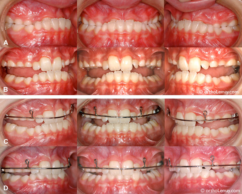(C) Avec l’appareil en bouche servant à ancrer le masque facial. (D) Après 2 mois, la relation des dents antérieures est déjà améliorée.