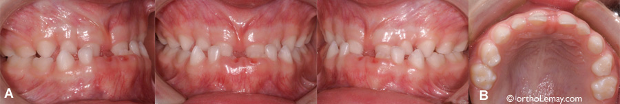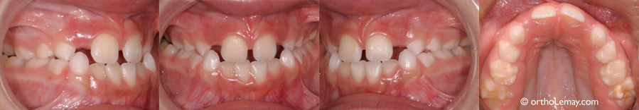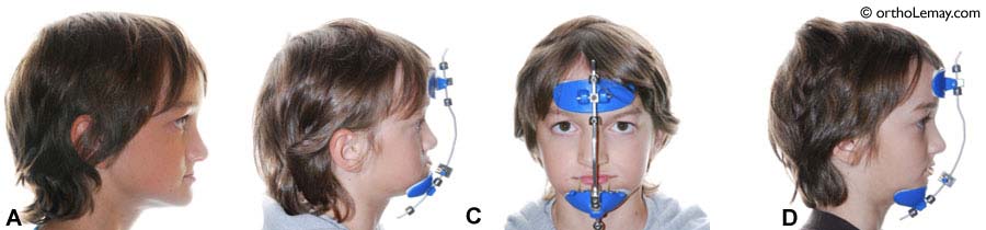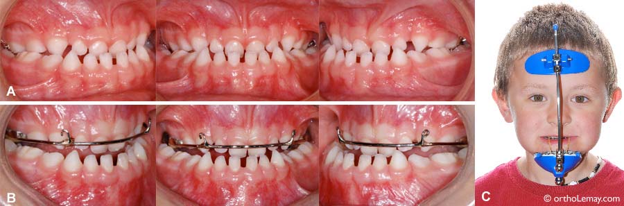 (A) Jeune garçon de 4.9 ans ans présentant une classe 3 squelettique sévère causée par une déficience maxillaire. Le traitement fut débuté alors que de garçon avait à peine 6 ans. Ce fort décalage entre les mâchoires justifie une intervention précoce.