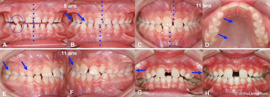 (C, D) Sans aucune intervention orthodontique, la même condition persiste 5 ans plus tard à l’âge de 11 ans. La croissance n’est pas suffisante pour corriger un tel problème. Les dents supérieures droites sont toujours basculées vers l’intérieur (flèches en B, D, E et F). (G, H) L’expansion maxillaire aura permis de rétablir l’équilibre entre la largeur des mâchoires et corriger la déviation mandibulaire.
