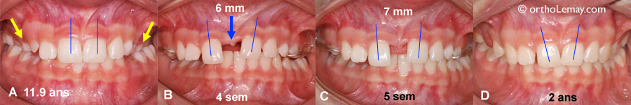 (D et G) L’expansion a créé un diastème de 8 mm entre les incisives centrales supérieures visible lors de l’immobilisation de l’appareil d’expansion.
