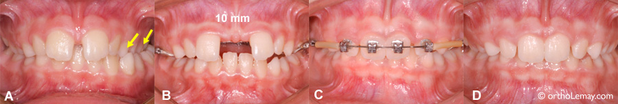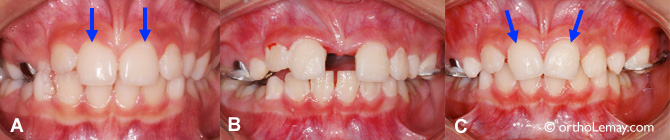 (B) À la fin de l’expansion, un espace important apparaît entre les incisives centrales qui sont toujours droites (flèches). (À noter le problème d’hygiène et l’accumulation de plaque dentaire.)