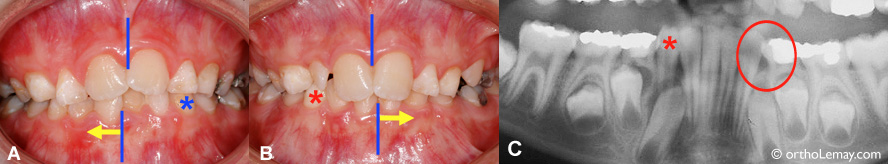 Il est indiqué d’extraire les dents temporaires avec les losanges rouges (radiographie). Ceci accélèrera et redirigera les dents permanentes qui les remplaceront et peut aider à améliorer le mauvais alignement des lignes médianes… sans toutefois le “garantir”.