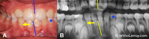 (A et B) La canine temporaire inférieure gauche est tombée de façon prématurée (flèche jaune), ce qui a entrainé les incisives inférieures et la ligne médiane (ligne bleue) vers la gauche. Pour tenter d’équilibrer la situation, il fut recommandé d’extraire la canine temporaire du côté opposé (*bleu) afin de permettre aux incisives de migrer vers la droite.