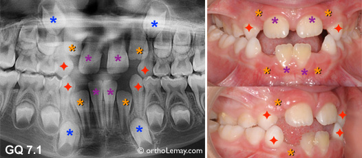 Cas GQ : Problèmes d’éruption et manque d’espace. Les incisives latérales de chaque arcade sont larges et n’auront pas l’espace suffisant pour faire éruption convenablement. Il y a de fortes chances qu’elles sortent du côté de la langue. Il serait indiqué d’extraire les canines temporaires (rouge).