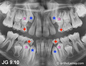 Cas JG : Après la sortie des latérales, ce sont les canines et premières prémolaires qui sont les prochaines dents à tenter de faire éruption mais qui manquent sévèrement d’espace. L’extraction des premières molaires temporaires (rouge) accélérera l’éruption des prémolaires et, à l’arcade du haut, peut aider à rediriger l’éruption des canines qui se dirigent sur les latérales. (Voir la légende pour identifier les dents)