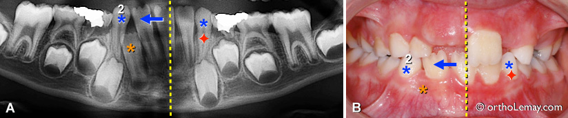 Autre situation “typique”; (A) La canine temporaire inférieure droite est tombée et les incisives ont migré vers la droite (flèche), ce qui a causé une migration de la ligne médiane (ligne bleue). (B) La radiographie montre qu’il n’y a pas d’espace pour l’éruption de la canine permanente. Il est indiqué d’extraire la canine temporaire du côté opposé (*), ce qui peut aider les incisives à migres vers la gauche, sans le garantir.