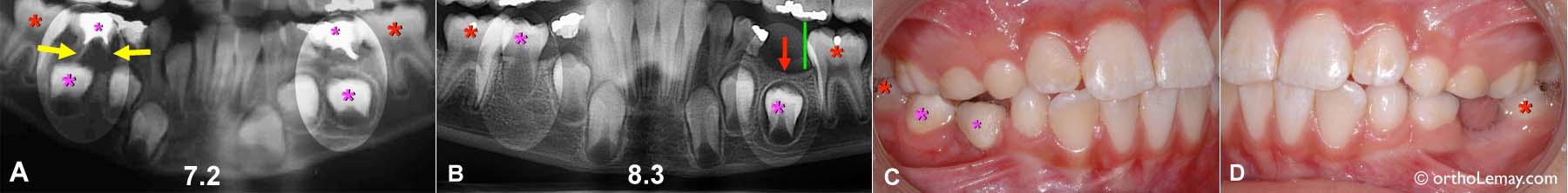 (C) Situation clinique à 8.3 ans. Du côté droit, la prémolaire (gros * rose) est complètement sortie et en occlusion avec la dent opposée. Le petit astérisque rose indique la première molaire temporaire qui est toujours en bouche.