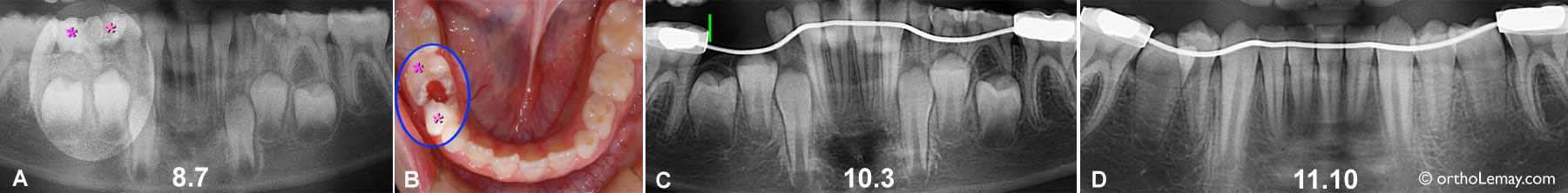 (A, B) Les 2 molaires primaires (*) e ce garçon de 8.7 ans étaient sévèrement cariées et ont dû être extraites.