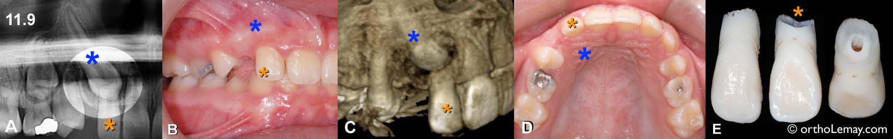Cas BJ – Comparaison de la région de la canine supérieur droite incluse palatine (*bleu) sur une radiographie panoramique standard (A) prise de façon routinière mais seulement à l’âge de 11 ans (fille). (B) L’apparence clinique ne permet pas de deviner le grave problème de résorption radiculaire qui affecte la racine de l’incisive latérale (*orange) au point de l’avoir “usée” à ±70 %. Cliché extrait d’un scan 3D (TVFC) qui montre la destruction de la racine de la latérale par la canine. (D) Vue occlusale montrant la position approximative de la canine (*bleu). (E) Différentes vues de l’incisive latérale qui a dû être extraite car sa racine était trop usée par la canine ectopique.