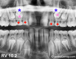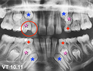 Cas VT : La première molaire temporaire supérieur droite est tombée de façon précoce ce qui a accéléré l’éruption de la prémolaire qui empiète maintenant sur l’espace réservé à la canine . La prémolaire est presque en contact avec l’incisive latérale (cercle). Il serait indiqué d’extraire les autres premières molaires temporaires restantes (étoiles rouge)pour aider l’éruption des autres premières prémolaires. (Voir la légende pour identifier les dents)