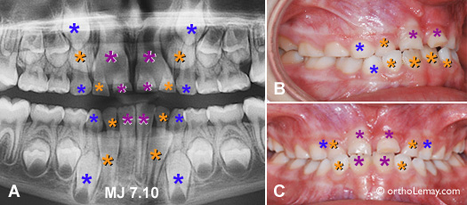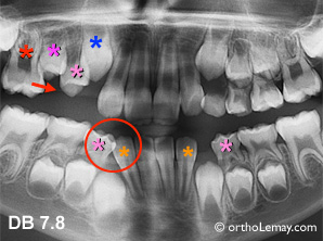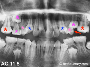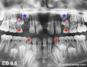 L’arcade inférieure est gardée sous observation mais il sera éventuellement indiqué d’extraire la molaire temporaire au dessus de la 2ième prémolaire inférieure gauche (*) qui penche vers l’arrière et ne résorbera pas les deux racines également. (Voir la légende pour identifier les dents)