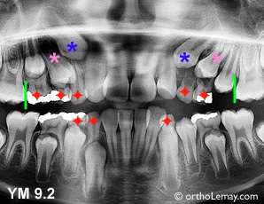 Cas YM : Situation similaires mais, vu que la formation des dents permanentes est plus avancée, la deuxième molaire temporaire droite peut aussi être extraite tandis que celle de gauche est déjà tombée par elle-même. Les lignes vertes indiquent qu’il serait indiqué d’utiliser un mainteneur d’espace afin d’éviter la migration des molaires permanentes vers l’avant.