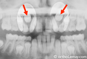 Cas RV : Mauvaise direction des prémolaires supérieures qui bloquent les canines. L’extraction des canines et premières molaires temporaires accélérera et redirigera l’éruption des prémolaires et aidera indirectement les canines.
