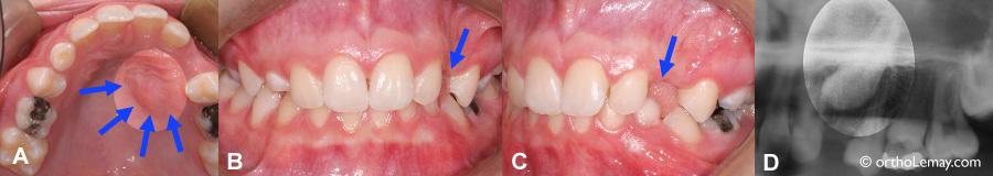 (A) Ce jeune patient se plaignait d’une “bosse au palais” (indiquées par les flèches).