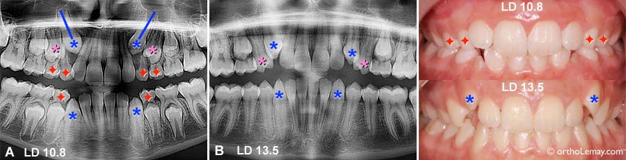 Cas LD : (A) À 10.8 ans, les canines et premières prémolaires supérieures sont inclinées vers l’avant. Les canines sont en contact avec les racines des latérales. (B) Près de 3 ans plus tard, après avoir fait des extractions sélectives , les canines se sont redressées et sortent dans une bien meilleure position. La situation s’est aussi améliorée à l’arcade inférieure. (Voir la légende pour identifier les dents)