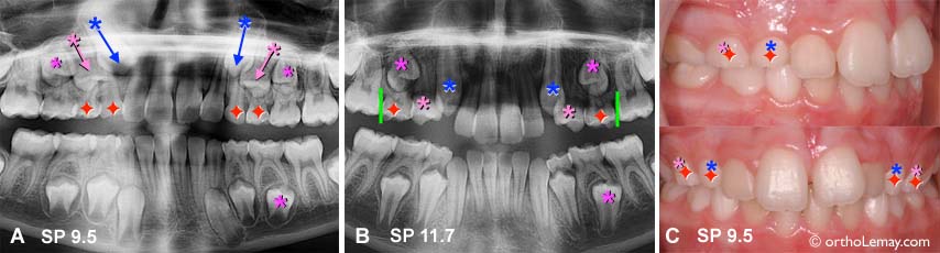 Cas SP : (A) À l’âge de 9.5 ans, la radiographie montre que la direction d’éruption des canines et premières prémolaires supérieures est déjà inclinée vers l’avant, particulièrement du côté droit. Des extractions sélectives sont alors proposées pour tenter d’influencer la direction d’éruption. (B) Une radiographie panoramique prise 2 ans plus tard montre comment les canines et les prémolaires on changé leur direction d’éruption. Les canines sont maintenant presque verticales. Les premières prémolaires font éruption. À ce stage, il est indiqué d’extraire les deuxièmes molaires temporaires supérieures ET de poser un mainteneur d’espace pour éviter la migration des molaires (lignes vertes) en attendant l’éruption des autres dents. (C) Photos cliniques correspondant à la radiographie en (A) et indiquant quelles dents temporaires seront extraites.