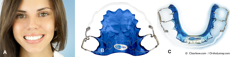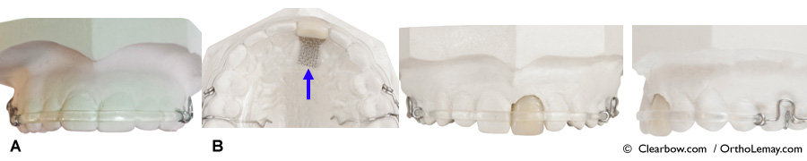 - (C) Coquille de rétention amovible avec des dents prothétiques remplaçant les incisives latérales.