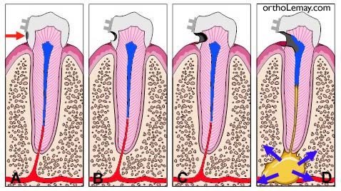 (A) La plaque dentaire peut s’accumuler sous les attaches orthodontiques et, si elle y demeure assez longtemps, causera une décalcification sur la surface de l’émail (zone grise). (B) À mesure que la décalcification progresse, elle pénètrera la surface et progressera dans la couche d’émail. (C) La cavité (carie) viendra qu’à atteindre la dentine (zone rose) et commencera à se diriger vers la pulpe de la dent (bleu). (D) Une fois la pulpe atteinte, plus rien n’arrête les bactéries et l’infection progresse à l’intérieur de la racine vers l’apex de la dent. Les bactéries sortent alors de la dent et commencent à détruire l’os alvéolaire environnant créant un abcès dentaire. Cette infection peut continuer à détruire l’os et peut se propager par les vaisseaux sanguins (rouge) (adapté de Williams & Wilkins).