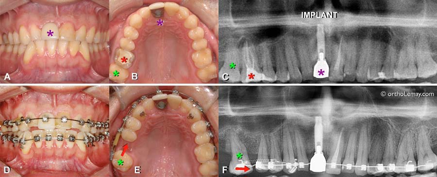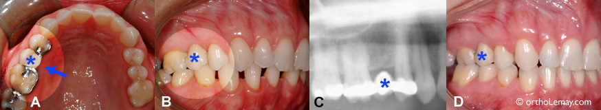 (A et B) Avant le début du traitement d’orthodontie. Le pont comprend une partie centrale suspendue et des attaches sur les dents adjacentes. (C) Radiographie montrant le pont et l’absence de la dent sous ce pont. (D) À la fin du traitement, le pont est intacte et dans la même position. Il aurait été possible de fermer les légers espaces restants si il y avait eu une dent naturelle pouvant être déplacée plutôt qu’un pont fixe et rigide.