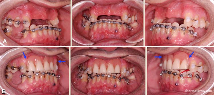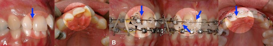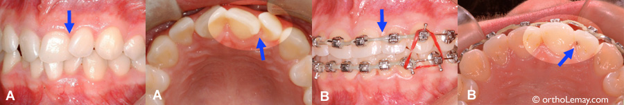 (A) Incisives en rotation et se chevauchement légèrement. (B) Une légère tache foncée (carie arrêtée) est visible après la correctino des rotations. (flèche)