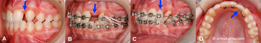 (A) Fille de 15 ans avec une latérale supérieure gauche manquante (flèche), (B) Ouverture de l’espace pendant l’orthodontie. (C) Pose d’une dent prothétique sur un bracket attaché sur le fil (arc) pour camoufler l’espace. À mesure que l’espace est ouvert, la dent peut être élargie pour combler l’espace. (D) À la fin du traitement, une dent temporaire peut être fixée sur une attelle de rétention. Ceci joue un rôle esthétique évident mais aussi préserve l’espace jusqu’à ce qu’une solution plus définitive puisse être envisagée (pont fixe, implant dentaire,etc.).