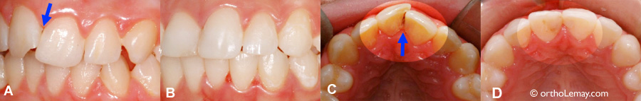 (A et B) La rotation de deux centrales camoufle une carie entre ces dents. (C) La carie est visible vue de l’intérieur de la bouche. (D) Après les corrections orthodontiques et la réparation de la carie.