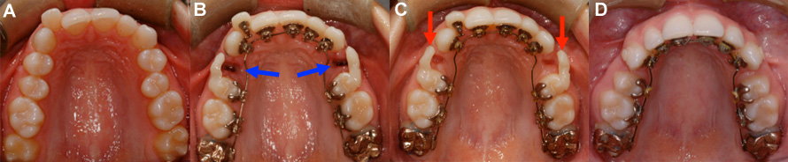 Rétraction de dents antérieures à l’aide de broches linguales iBraces. (A) Condition initiale avec dents antérieures avancées et chevauchées. (B) Une prémolaire a été extraite de chaque côté (flèches bleues) afin de donner l’espace nécessaire pour reculer les dents antérieures. (C) Facettes collées sur les prémolaires (flèches rouges) pour camoufler l’espace d’extraction pendant la rétraction. (D) Après quelques mois, les dents sont partiellement reculées, l’espace d’extraction a diminué et les facettes peuvent être enlevées. Ce cas en cours de traitement n’était pas terminé lors du montage photographique.
