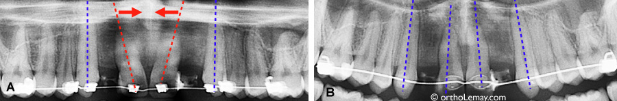 (A) Parallélisme de racine et espace inadéquat entre les racines pendant le traitement d’orthodontie. (B) Après quelques mois, les racines sont parallèles et il y a assez d’espace pour la pose d’implants dentaires dans les espaces édentés.