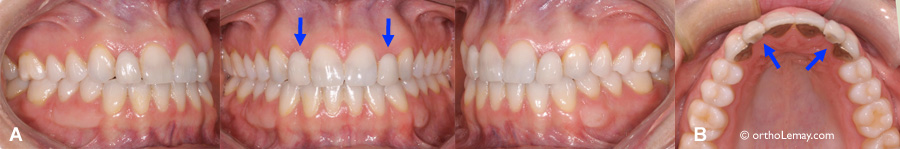 Dans ce type de cas, bien que 2 dents soient principalement visées par ces corrections (les incisives centrales dans le cas ci-dessous et les incisives latérales dans le cas précédent), il est nécessaire de poser des appareils sur au moins les 6 dents antérieures et une dent postérieure pour bien contrôler la mécanique orthodontique et les forces utilisées.
