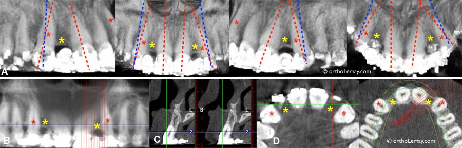 Utilisation de radiographies volumiques tridimensionnelles pour évaluer la position des racines des canines et des incisives latérales supérieures en prévision de la pose d’implants dentaires pour remplacer les incisives latérales manquantes (* jaune). (A) Les pointillés rouges indiquent l’axe (inclinaison) des dents avant le traitement et les pointillés bleus représentent la position idéale que devraient avoir les incisives latérales pour permettre la pose d’implants sans interférer avec les racines des dents. (B) Des coupes à la fraction de millimètre près permettent d’évaluer l’os et les racines. (C) Vue en coupe de côté (sagittale). (D) Vue en coupe axiale (vue occlusale) à travers les couronnes et les racines montrant l’espace et l’os entre les dents.