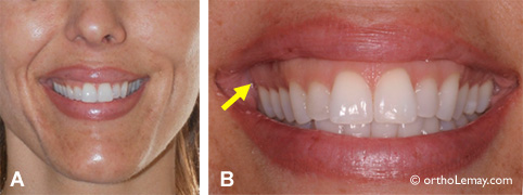 Un sourire peut paraître asymétrique pour plusieurs raisons. (A) cette femme de 38 ans (non traitée en orthodontie) présente plusieurs asymétries au niveau du visage; le nez, les lèvres, les dents et le menton de sont pas alignées, ce qui augmente l’effet d’asymétrie. (B) Lors du sourire, plus de gencive (flèche) est visible à droite (sourire gingival). Ceci peut être causé par un dégagement inégal de la lèvre et/ou un excès vertical du maxillaire d’un seul côté.