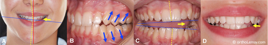 Plusieurs facteurs contribuent au sourire asymétrique de cette adolescente de 15 ans. (A) La mandibule (menton) présente une légère déviation vers la droite ( par rapport à la ligne rouge centrale), le plan occlusal des dents est incliné vers le bas (lignes bleues en A et C) et les dents sont inclinées vers la gauche (pointillés jaunes en A et D). De plus, la langue se positionne entre les dents postérieures gauches et empêche les dents de se toucher (B et D) contribuant aussi à l’asymétrie.