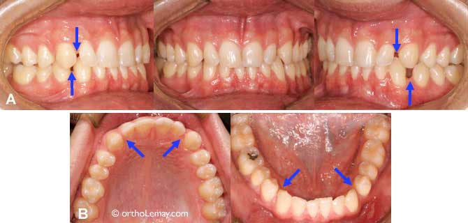 (B) Vue occlusale démontrant le manque d’espace entre les dents.