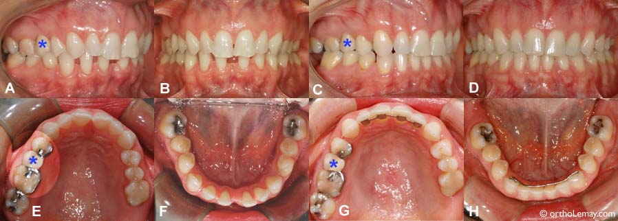 (C, D, H) Après l’orthodontie, les espaces sont fermés et les dents rapprochées. Un fil de rétention est essentiel pour prévenir une ré-ouverture des espaces. À noter qu’il reste de légers espaces à droite (visibles en C et G). Cette patiente de 46 ans avait un pont papillon (indiqué par un astérisque *) qui empêchait tout mouvement des dents postérieures droit et a empêché la fermeture de ces légers espaces pour prévenir que le pont doive être refait si on désirait bouger ces dents.