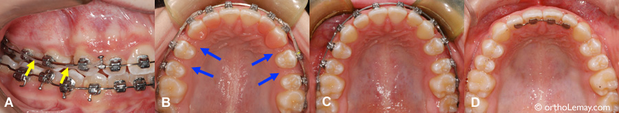 (B) Après la fermeture de l’espace, une attelle de rétention est posée sur la face interne pour prévenir la ré-ouverture de l’espace en stabilisant les dents.