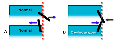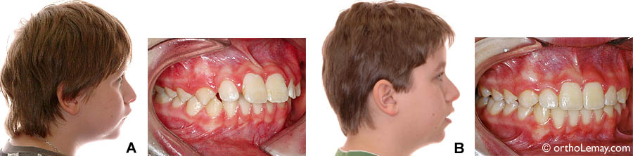 (A) Garçon de 12 ans traité en orthodontie pendant une période de croissance ce qui a permis d’améliorer la relation des mâchoires (B) Résultat après 14 mois. Sans croissance une chirurgie est nécessaire chez l’adulte pour corriger un tel déséquilibre d’où l’importance d’un suivi et intervention précoces pendant la croissance et le développement de l’enfant.