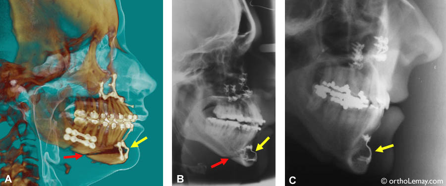 Radiographies montrant des chirurgies d’avancement du menton. Les flèches rouges indiquent la ligne de coupe. Cette dernière sera remplie par l’os éventuellement. Les flèches jaunes indiquent les plaques de fixation rigides qui unissent les deux segments de l’os du menton pendant la guérison et solidification de l’os.