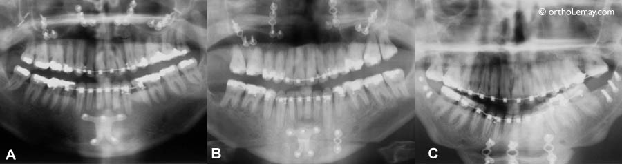 (A, B et C) Des radiographies panoramiques montrent la présence de plaques de fixation chez des patients ayant eu une chirurgie au menton (génioplastie d’avancement ou de recul). (A et B) montrent aussi des plaques utilisées pour immobiliser la mâchoire supérieure suite à une chirurgie et (C) montre des vis à l’arrière de la mandibule suite à un avancement de la mâchoire inférieure.