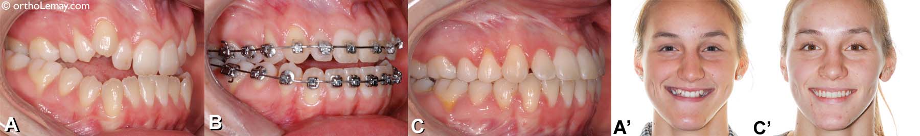 En plus de l’orthodontie ayant corrigé la position des dents, une chirurgie d’avancement du menton (génioplastie) a permis de changer le profil de cette adolescente de 18 ans. Photos : (A) Avant l’orthodontie, (B) après l’orthodontie et (C) après la génioplastie. – (Courtoisie : Dr Sylvain Chamberland, Québec)