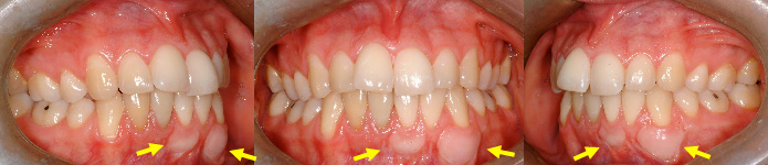 (A, B) Malgré la présence d’une légère récession gingivale sur les dents indiquées par les flèches, ce déchaussement n’a pas augmenté pendant le traitement pour le cas (A) et est demeuré stable plus d’un an après la fin du traitement pour le cas (B).