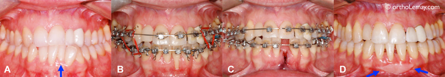 (A) Avant le traitement, l’incisive inférieure gauche est basculée à l’intérieur de l’arcade dentaire (flèche) . À cause du déséquilibre squelettique entre les mâchoires et l’étroitesse de l’arcade, l’alignement de cette incisive la déplacera vers l’avant. (B) L’alignement a causé une perte importante de gencive et d’os alvéolaire qui supportent la dent (récession/déchaussement). (C) Il fut alors décidé d’extraire l’incisive et de fermer l’espace en orthodontie. (D) Résultat final à la fin de l’orthodontie. Une greffe gingivale fut faite (flèches) pour améliorer la qualité de la gencive restante devant les autres incisives.