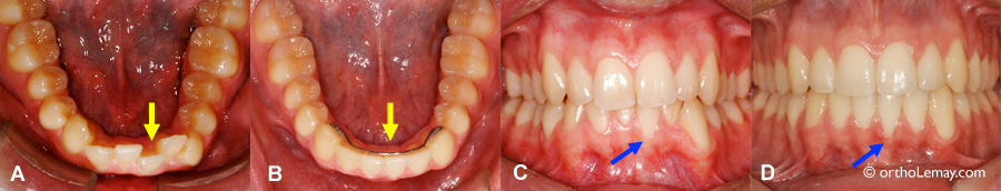Ce jeune homme de 18 ans qui entreprendra un traitement d’orthodontie pour corriger sa malocclusion. Il présente une arcade supérieure très étroite (D) en forme de “V” et une occlusion croisée postérieure bilatérale (A, B, C). Bien qu’il ait une bonne qualité de gencive en général (largeur et épaisseur des tissus), plusieurs dents (indiquées par les flèches) ont différents degrés de déchaussement avant même le début du traitement. L’arcade du haut devant être élargie alors il faudra surveiller de près le niveau de gencive pendant l’orthodontie car, s’il venait qu’à diminuer significativement, des greffes de gencive ou autres procédures parodontales pourraient être nécessaires. Le patient devra porter une attention particulière à son hygiène buccale et sa technique de brossage pendant le traitement afin de ne pas contribuer davantage à la perte de gencive.