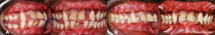 Malgré la gravité de la malocclusion et des problèmes parodontaux affectant ce jeune adulte (24 ans), un traitement d’orthodontie peut être possible. Ceci nécessite une approche inter-disciplinaire et un suivi régulier avec un parodontiste pendant le traitement. La condition parodontale très avancée a complètement détruit l’os autour des racines des incisives centrales inférieures de sorte que ces dents étaient irrécupérables et durent être extraites. Ces photos illustrent le résultat après les corrections orthodontiques.