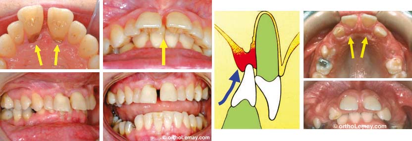 En présence d’un surplomb antérieur vertical excessif (overbite), les dents inférieures peuvent mordre dans la muqueuse du palais et l’endommager en causant du déchaussement et éventuellement une perte osseuse. Un phénomène similaire, l’affaissement postérieur de l’occlusion, peut se produire lors de la perte de dents postérieures qui servent de “fondation” à l’occlusion. La perte des dents cause des déplacements antérieurs, des espaces, etc. Pour en savoir plus sur ce sujet, suivez le lien ci-dessous.