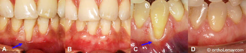 (A) Déchaussement important d’une incisive inférieure. (B) Une greffe gingivale a permis de restaurer le niveau normal de gencive et recouvrir la racine (10 semaines après la greffe). (C) Racine d’une canine ayant perdu plusieurs millimètres de gencive. (D) Le tissu greffé se confond parfaitement avec la gencive environnante et procure une protection à la racine. (Courtoisie, Dr K. Jarjoura)